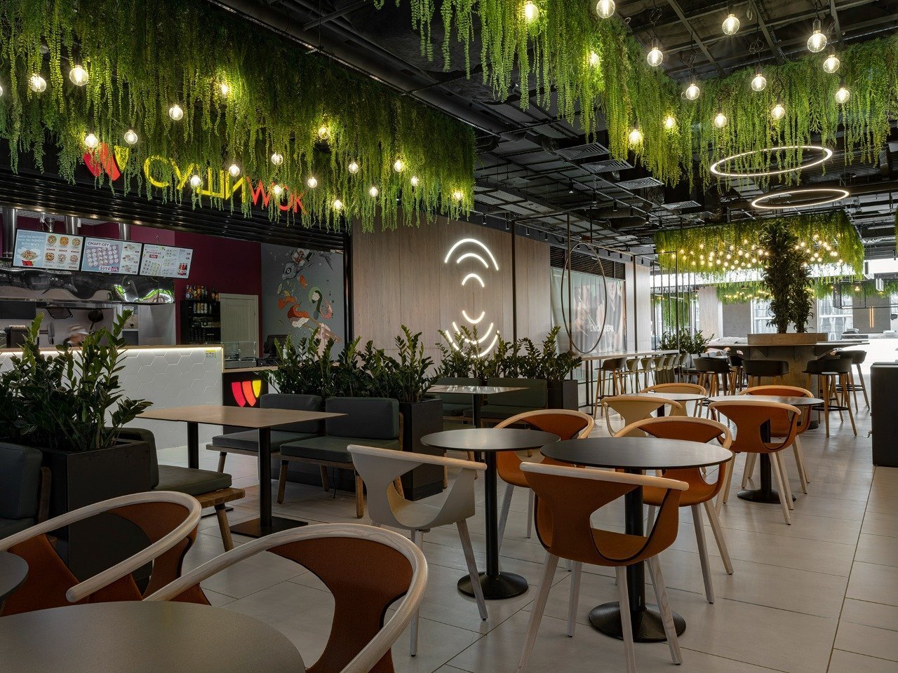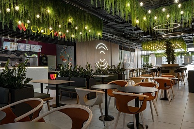 Дизайн интерьеров разработан бюро Blank Architects, которые придумали для проекта уникальные световые инсталляции и предложили идею скопления звездопада. Особое место в интерьере заняли панорамные окна, обрамляющие периметр фуд-холла, с видами на Химкинский лес. Современные решения в дизайне и архитектуре, а также состав арендаторов и наличие крупнейшего фуд-корта — все это позволяет стать торговому центру идеальным местом для семейного досуга.