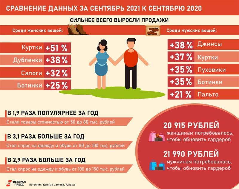 По сравнению с прошлым годом спрос на предметы осенне-зимнего женского гардероба в сентябре показал существенный рост. По данным Lamoda, больше всего выросли продажи курток (+51%), дубленок (+38%), сапог (+32%) и ботинок (+25%).