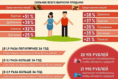 Мужчины также активно готовились к зимнему сезону уже в начале осени. Самыми востребованными товарами в этот период оказались мужские джинсы (+38%), куртки (+37%), пуховики (+35%), ботинки (+35%) и пальто (+21%).