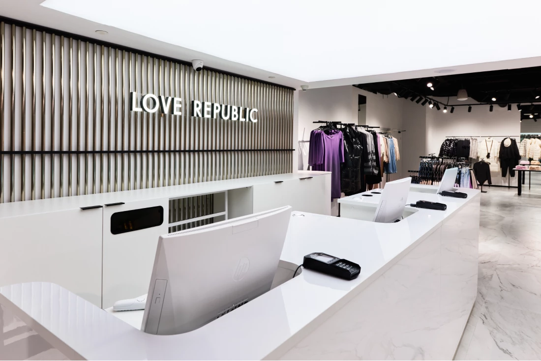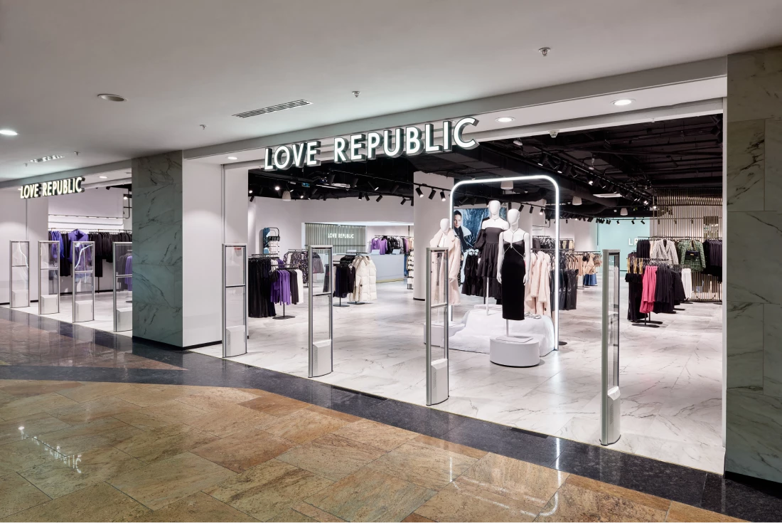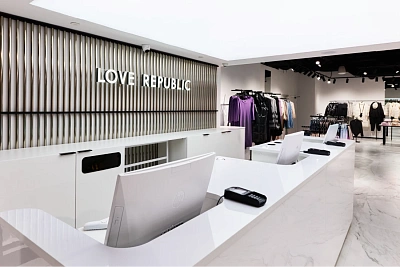 Новый розничный проект LOVE REPUBLIC, занявший 720 кв. м., разработан самой компанией. Концепция учитывает актуальные мировые тренды в архитектурном дизайне и визуальном мерчендайзинге: обтекаемые формы, светлые тона, сочетание разных текстур и материалов.