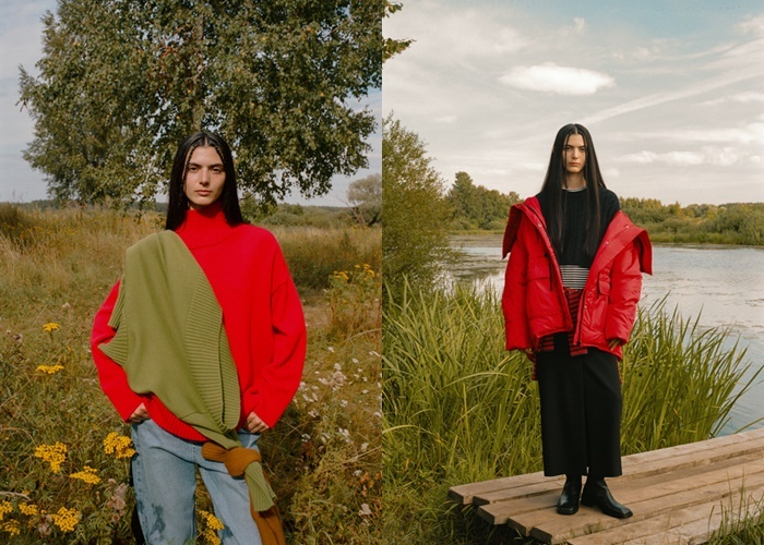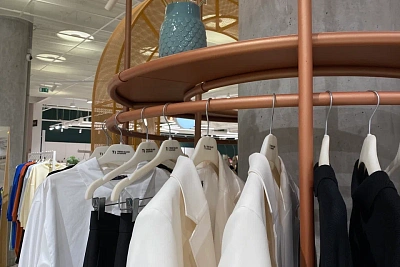 В интерьере магазина доминируют натуральные оттенки, а большие окна пропускают много естественного света. Кроме того, были оформлены просторные примерочные.