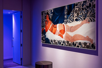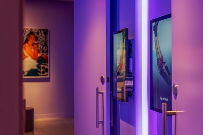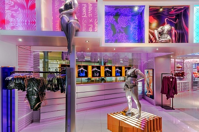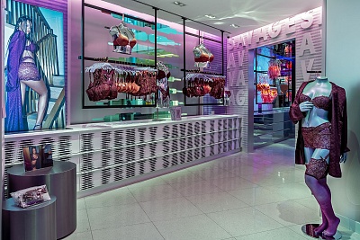 Новый магазин отличается ярким дизайном в красных, синих и фиолетовых тонах и наполнен неоновым светом. Пять тематических комнат спроектированы как для интерактивного опыта, так и для проведения фотосессий. Бутик оснащен новыми VR-технологиями, помогающими определить свой размер и подобрать подходящую модель. Кроме того, примерочные имеют цифровые витрины для просмотра ассортимента бренда.