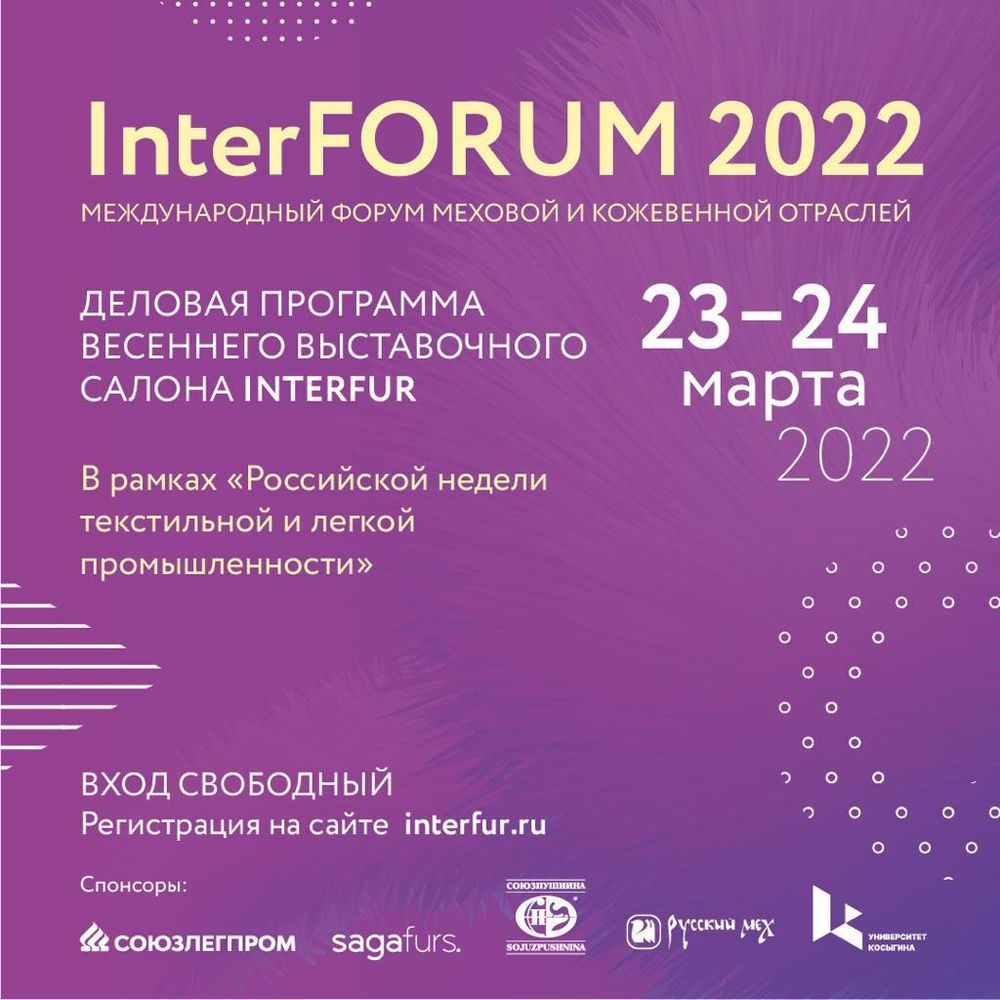 23 и 24 марта 2022 года в рамках «Российской недели текстильной и легкой промышленности» на территории РГУ им. А. Н. Косыгина (Москва, ул. Малая Калужская д.1) пройдет деловая программа весеннего выставочного салона кожи и меха InterFUR2022.