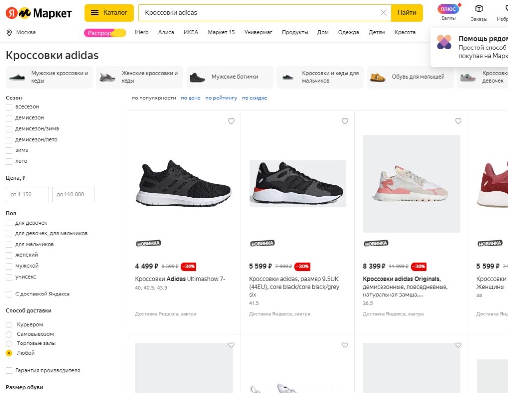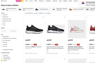 Например, «Яндекс Маркет» готов предложить широкую линейку кроссовок известных обувных франшиз бренда — таких как Stan Smith, Superstar, Continental 80, NMD, Falcon, Ultraboost, 4D, Terrex и других. Также покупателям площадки стали доступны изделия из лимитированных серий adidas, выпущенных совместно со знаменитостями и другими брендами. Среди них — Y-3, Stella McCartney, Pharrell Williams, Pusha T, Paolina Russo, Jeremy Scott, Human Made, Lego. Но основную часть ассортимента бренда на «Яндекс Маркете» составляет продукция для занятий спортом (бегом, футболом, теннисом, плаванием, баскетболом и другими видами), а также одежда для повседневного использования adidas Originals.